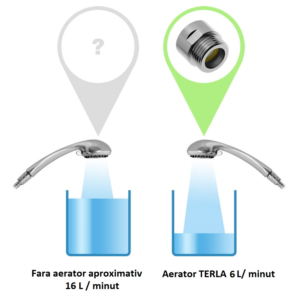 ECONOMIE DE APA de pana la 50% fara a diminua foarte mult confortul in utilizare. O baterie de dus standard nu este echipata cu accesorii de reducere a consumului de apa are un debit mediu de 13-16 l/min. Aeratorul se monteaza foarte usor la furtunul de dus. Fara un aerator, de obicei, apa curge din para de dus cu un flux mare.