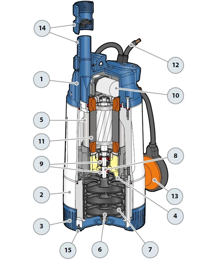 Datorită construcției multietajate, pompa oferă presiune ridicată și funcționare silențioasă, fiind echipată standard cu plutitor pentru funcționare automată.